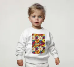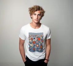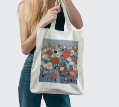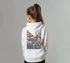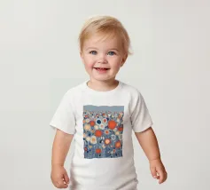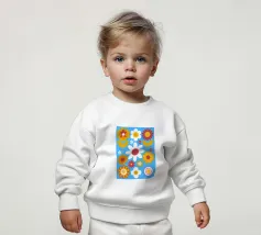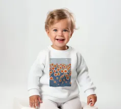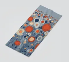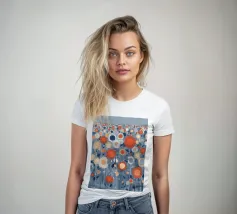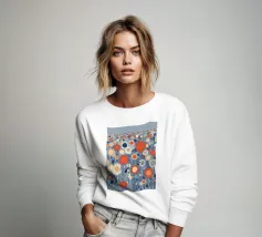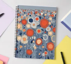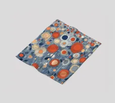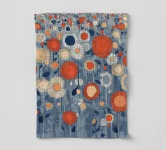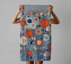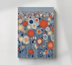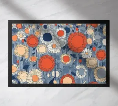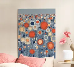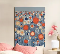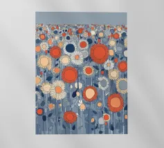Un campo infinito di fiori grafici nei colori vivaci dell'arancio, del blu e del crema: moderno, giocoso e pieno di energia. La ripetizione ritmica crea una sensazione di infinito e leggerezza. Questo motivo porta il calore dell'estate e una moderna dichiarazione di design in ogni stanza.