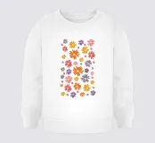 Un motivo floreale giocoso che sembra una passeggiata visiva in un festival di giardini retrò: I fiori stilizzati, nei colori arancione, rosa, viola, rosso e giallo, danzano liberamente. Ogni fiore ha una forma semplice, simile a una margherita, con lunghi petali a raggiera che emergono da un punto centrale. La disposizione è volutamente irregolare, come un disegno sparso di gioia, estate e nostalgia.