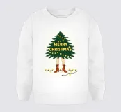 Divertente arte natalizia di una donna che indossa stivali da Babbo Natale e cerca di montare un albero di Natale. Le luci fiabesche cadono a terra mentre lei indossa l'albero di Natale.