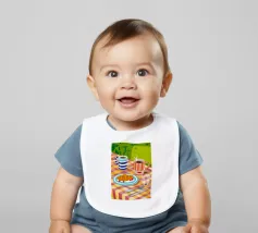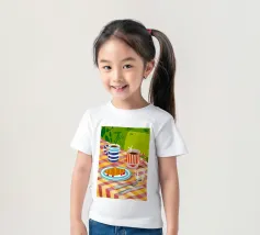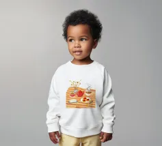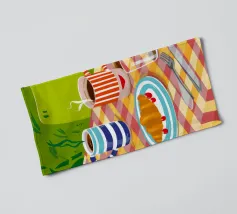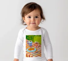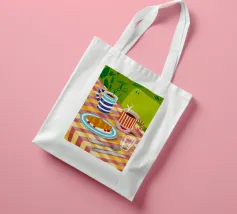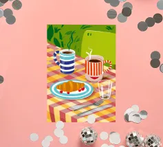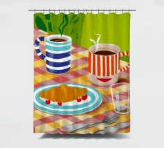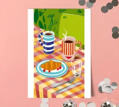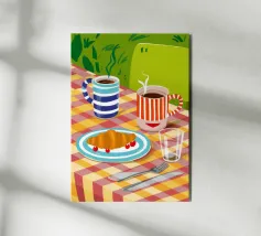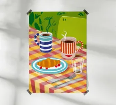 Una classica scena di colazione con un croissant su un piatto e una tazza di caffè con cannuccia a righe, su una tovaglia di percalle gialle. La composizione è calda e invitante, con un'atmosfera da caffè accogliente e senza tempo.