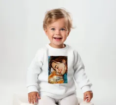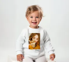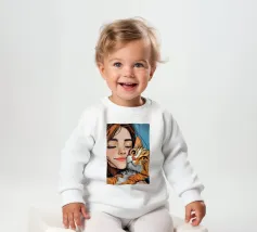 Questo dipinto raffigura una persona dai lunghi capelli neri avvolta in una coperta a motivi cardiaci, che tiene in braccio un gatto. Il morbido sfondo beige esalta il tono accogliente e confortante.