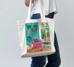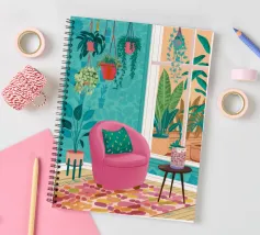 Una stanza vibrante di ispirazione tropicale con una parete turchese, una poltrona rosa e un'abbondanza di piante rigogliose. La scena è un paradiso di colori e vita, che crea un'atmosfera allegra, energica e di evasione.