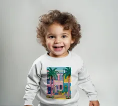 Una vivace illustrazione di una colorata città collinare, con case, scale e piante molto vicine. La scena è una rappresentazione vivace, gioiosa ed energica di una comunità mediterranea o sudamericana.