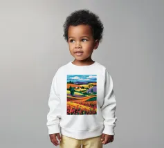 Un paesaggio panoramico delle dolci colline toscane, con strade tortuose, cipressi e campi resi con una tavolozza di colori ricchi e caldi che cattura la bellezza della campagna italiana.