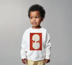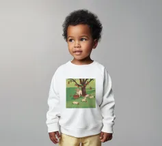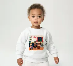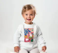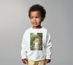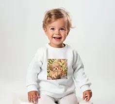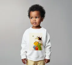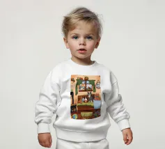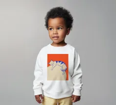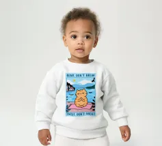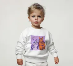 Un'ambientazione serena sulla spiaggia presenta un gatto seduto su cuscini impilati insieme ad altri due gatti, tutti intenti a guardare il tramonto. Le tonalità tenui e l'atmosfera pacifica evocano tranquillità e unione.