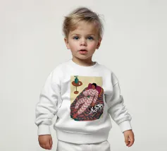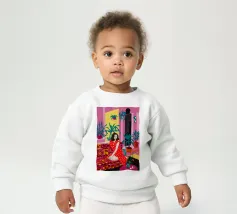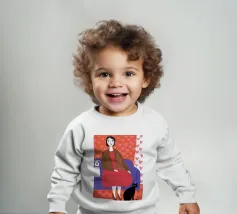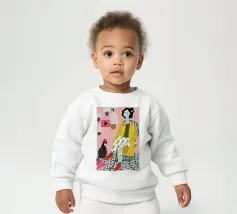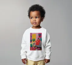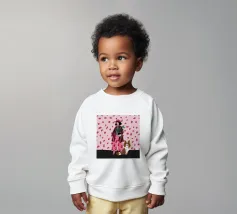 Una donna si trova in una cucina dai colori vivaci con un dalmata al suo fianco, una finestra che mostra una scena all'aperto e vari dettagli della cucina, creando un'illustrazione domestica eccentrica e affascinante.