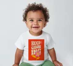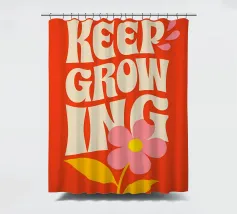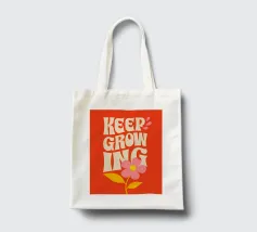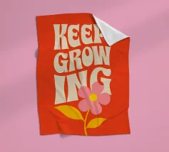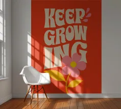 Questa vivace e allegra opera d'arte digitale presenta il messaggio incoraggiante "KEEP GROWING" impilato verticalmente in un carattere bianco sporco di ispirazione retrò su uno sfondo arancione deciso. Un fiore rosa stilizzato con un centro giallo brillante e due foglie gialle aggiunge un tocco di natura e ottimismo al disegno. L'estetica complessiva è positiva ed edificante e promuove i temi dello sviluppo personale e della prosperità.