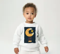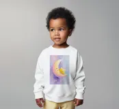 Una luna dipinta a mano a guazzo abbraccia una piccola stella, entrambe sorridono dolcemente. I toni pastello e le texture delicate creano una cameretta sognante e rilassante con uno sfondo pulito e pastello.