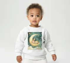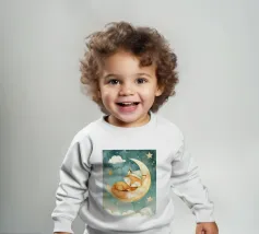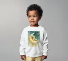 Una luna dipinta a mano a guazzo abbraccia una piccola stella, entrambe sorridono dolcemente. I toni pastello e le texture delicate creano una cameretta sognante e rilassante con uno sfondo pulito e pastello.