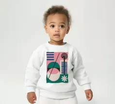 Una moderna composizione astratta mostra forme organiche e audaci nei colori rosso e blu, che si fondono con piccoli elementi neri e gialli su uno sfondo neutro.