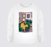 Una donna si accoccola su un divano verde, immersa in un libro e con una tazza di tè vicino. La stanza è decorata con piante e opere d'arte, creando una scena perfetta di confortevole solitudine e fuga intellettuale.