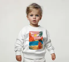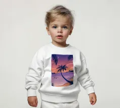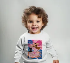 Questa immagine raffigura una donna in bikini rosso che cavalca il dorso di un grosso cane mentre fa surf su un'onda. Lo sfondo è caratterizzato da un tramonto colorato con un cielo sfumato che passa dal blu all'arancione.