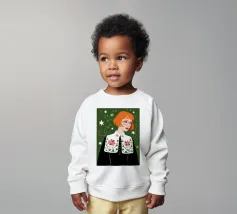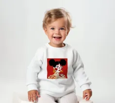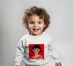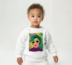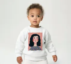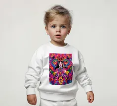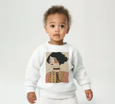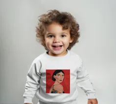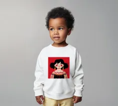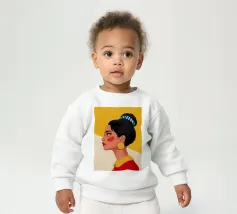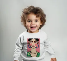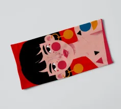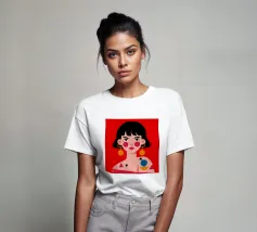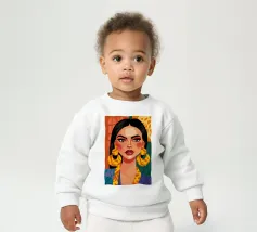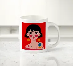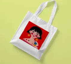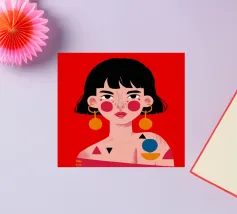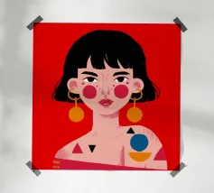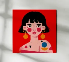 Questo dipinto raffigura una persona con i capelli neri che indossa un abito colorato con forme geometriche. Lo sfondo è rosso e la persona è adornata con grandi orecchini circolari.