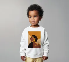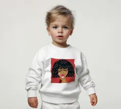 Questo dipinto raffigura una persona con i capelli scuri acconciati in due chignon, che indossa grandi orecchini arancioni. Il volto della persona è dipinto con audaci motivi rossi e bianchi, mentre lo sfondo è di colore rosso pieno.