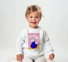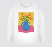 Un'illustrazione semplice e allegra di un bouquet di fiori arancioni in un vaso blu a righe ondulate su uno sfondo giallo sole. L'opera d'arte è luminosa e allegra, con un'affascinante sensazione di disegno a mano.