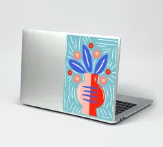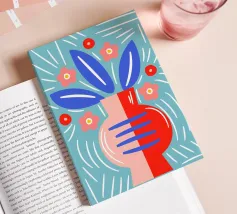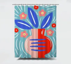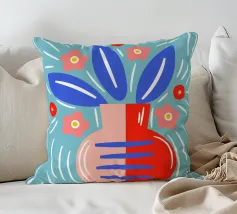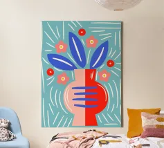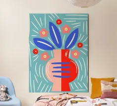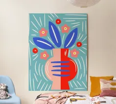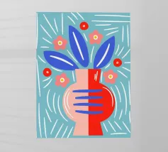 Ravvivate la vostra casa con questo moderno motivo floreale. Il vaso stilizzato in rosso e rosa, circondato da foglie blu e fiori delicati su uno sfondo azzurro, conferisce a questo disegno un aspetto grafico e contemporaneo. Ideale per decorazioni murali, cuscini, tazze, cover per cellulari e molto altro ancora. Questo motivo è perfetto per chi ama i disegni giocosi e colorati con un tocco di arte e modernità. Crea accenti vivaci e si adatta a un'ampia varietà di stili di interni.