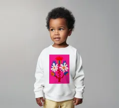 Fiori stilizzati rossi e rosa dalle forme semplici e decise si stagliano su uno sfondo ricco e scuro, creando un design floreale retrò e grafico con un tocco di nostalgia.