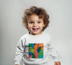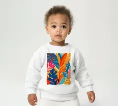 Una composizione astratta ed energica di foglie e forme rese in una tavolozza primordiale di rosso, giallo, verde e blu, con pennellate audaci ed espressive.