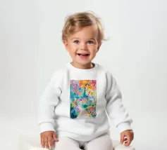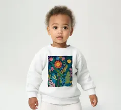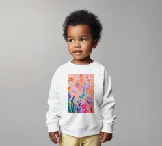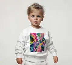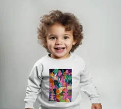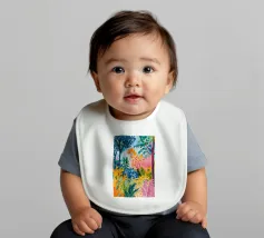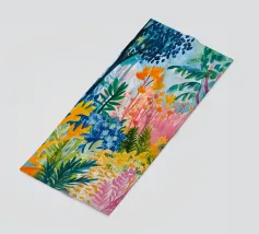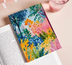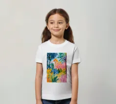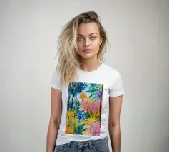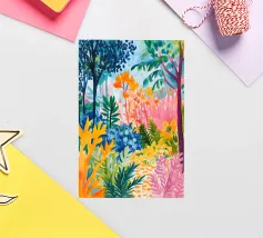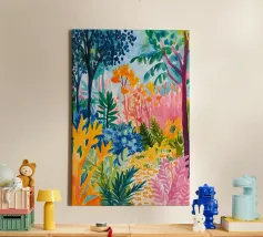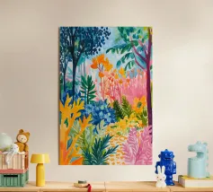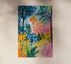 Una scena di foresta vivace e colorata è caratterizzata da un fogliame lussureggiante nei toni del blu, dell'arancio, del rosa e del verde. Varie piante e alberi creano una composizione vivace e dinamica con colori vivaci e contrastanti. L'uso di colori vivaci conferisce alla scena un'atmosfera energica e stravagante.