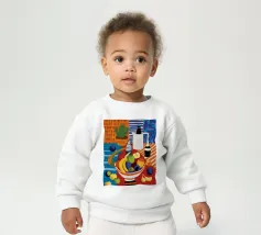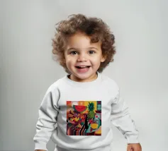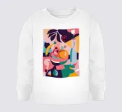 Una natura morta astratta giocosa e colorata con forme decostruite che rappresentano frutta, foglie e vasi. La composizione energica e la tavolozza vivace creano un'interpretazione gioiosa e moderna di un tema classico.