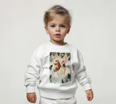 Questo dipinto illustra la scena di una persona sdraiata su un asciugamano a righe accanto a una tigre. Il fogliame tropicale riempie lo sfondo, creando un'atmosfera lussuosa ed esotica.