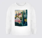 Una vivace scena di giardino è animata da colori, con alti cipressi, arbusti rosa in fiore e fiori blu, tutti dipinti in uno stile fauvista altamente espressivo che irradia energia e gioia.