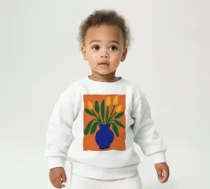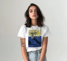 Un'elegante illustrazione di natura morta incentrata su un vaso di vetro trasparente che contiene fiori bianchi e gialli. La composizione è definita da una lunga e drammatica ombra blu proiettata dal vaso, che suggerisce una forte fonte di luce e aggiunge un senso di tempo e di tranquilla drammaticità alla scena.