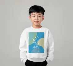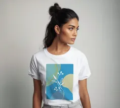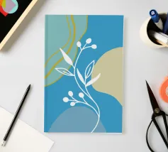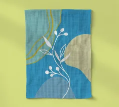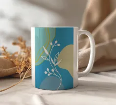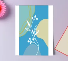Un ramo stilizzato con foglie e bacche si staglia su uno sfondo astratto di forme blu, verdi e gialle. Le forme fluide e le morbide sfumature di colore danno un senso di armonia e di calma.