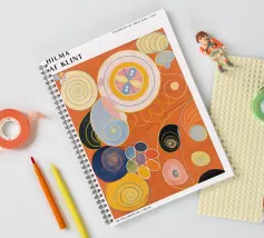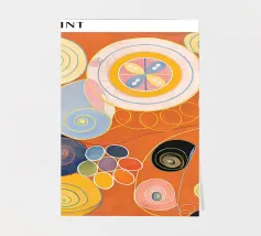 Questo vibrante poster di mostra presenta "The Ten Largest, No. 3, Youth" di Hilma af Klint, un'ipnotica opera astratta su un caldo sfondo arancione. La composizione è un ricco arazzo di spirali vorticose, cerchi concentrici e forme organiche in una tavolozza di gialli, blu, rosa e viola. Quest'opera mostra la visione spirituale e astratta pionieristica di Klint, che esplora i temi della crescita e dello sviluppo attraverso un intricato simbolismo. Il poster identifica Klint come "PIONIERE DELL'ARTE ASSTRATTA". Questo poster digitale di alta qualità (7000x5000 pixel, 300 dpi) cattura magnificamente l'e