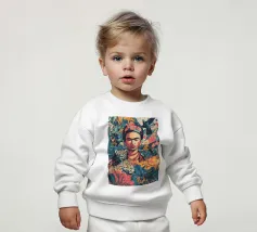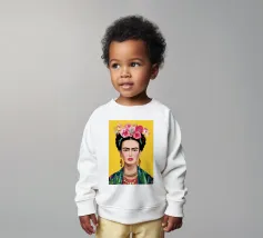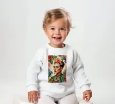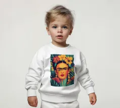 Questo vibrante ritratto di Frida Kahlo la ritrae in costume tradizionale messicano con una colorata corona di fiori che incarna il suo legame con il folklore e il simbolismo femminista.