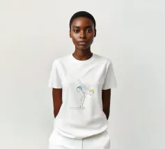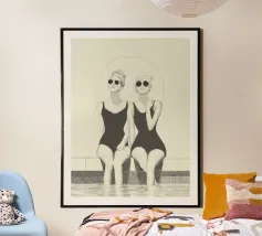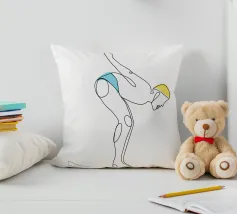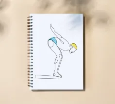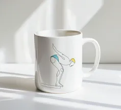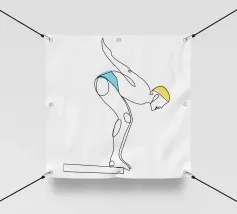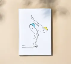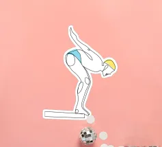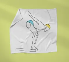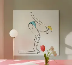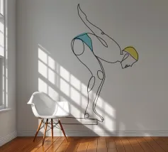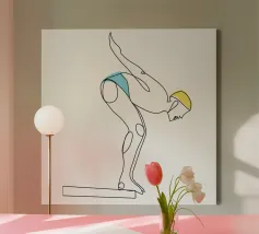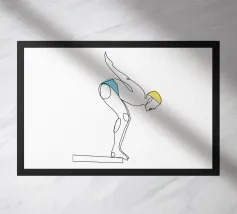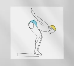 Cattura l'eleganza di un tuffatore maschio di metà secolo su un trampolino, illustrato in una line art minimalista con tenui colori pastello, questo splendido design aggiunge un tocco di vntage a qualsiasi prodotto.