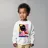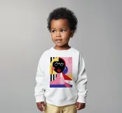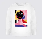 Il ritratto astratto di una donna nera ha un'espressione serena ed equilibrata, con le sue forme splendidamente integrate in uno sfondo di motivi e forme geometriche audaci e colorate.