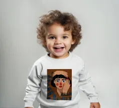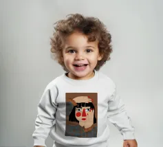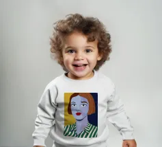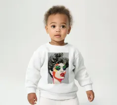 Un ritratto grafico di grande impatto di una donna con un'acconciatura nera e labbra rosse, con lo sguardo intenso rivolto all'osservatore, su uno sfondo colorato e astratto.