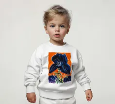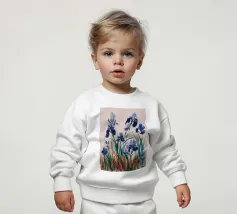 Una rappresentazione dettagliata e vibrante di un singolo fiore di iris in piena fioritura, che mostra i suoi intricati petali nei toni del blu, del viola, del bianco e del giallo. L'attenzione si concentra sulla maestosa bellezza del fiore.