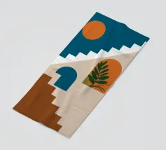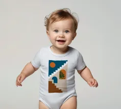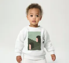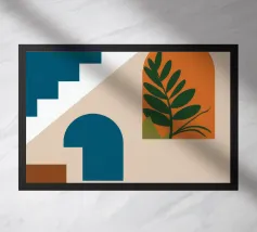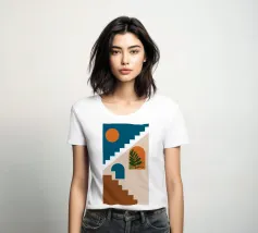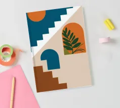 Illustrazione architettonica minimalista di una scala color terracotta che sale verso un sole luminoso e un cielo blu. La composizione è una metafora di speranza, moderna e potente per un viaggio verso l'alto.