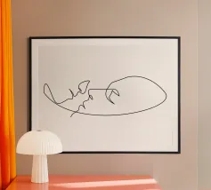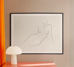 Un disegno minimalista che cattura la grazia tranquilla di una figura femminile vista da dietro. La sua silhouette, disegnata con un tratto continuo, evoca morbidezza, sicurezza e una tacita intimità. Un'elegante rappresentazione della forma femminile attraverso la semplicità e la fluidità.