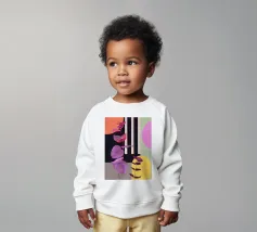 Una mano è raffigurata mentre si dirige o interagisce con fiori e foglie geometriche stilizzate su uno sfondo suddiviso in blocchi di colore rosa, giallo e bianco. Lo stile è moderno, grafico e astratto.