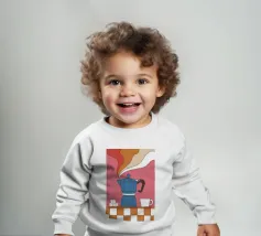 Un'illustrazione accogliente e invitante di un caffè versato in un'allegra tazza gialla a pois. Il vapore che sale e i colori caldi creano una rappresentazione perfetta di un confortante rituale mattutino del caffè.