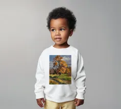 Un dipinto paesaggistico espressivo raffigura un fiume che serpeggia in una valle con alberi dalle tonalità autunnali o crepuscolari di rosa, arancione e viola, sotto un cielo drammatico e colorato, che evoca una scena lunatica e vibrante.