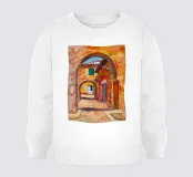 Una vista attraverso un arco in pietra rustica e rovinata dalle intemperie rivela una vivace scena di mercato, con i toni caldi e terrosi dell'architettura che creano una cornice senza tempo per un momento di vita quotidiana.