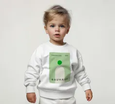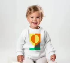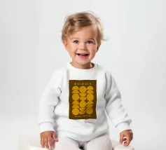Il design minimalista è caratterizzato da tre forme semicircolari in bianco, senape e giallo impilate verticalmente. L'uso semplice ma deciso del colore e della forma crea un contrasto visivo sorprendente.