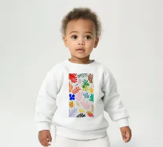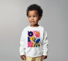 Un motivo vivace e senza soluzione di continuità di foglie stilizzate e forme botaniche in una tavolozza di rosso, blu, rosa e giallo, che crea un senso di movimento ritmico e naturale.