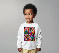 Un paesaggio surreale pieno di figure astratte, animali e forme geometriche. L'uso dinamico di colori vivaci e disegni intricati evoca immaginazione e curiosità.