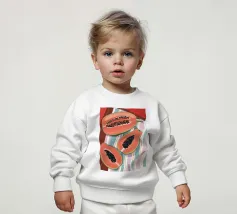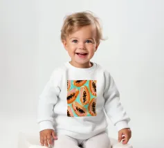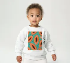 Un'illustrazione vivace e stilizzata di papaya a fette con foglie verde scuro su uno sfondo chiaro. Il motivo ripetitivo e il colore arancione brillante creano un'atmosfera fresca e tropicale.