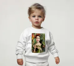 Frida Kahlo gusta il suo caffè in una tazza di fiori, circondata da elementi botanici e accenti floreali. Il suo autoritratto emana eleganza e stile boho, mentre i verdi tenui e i toni della terra sottolineano la sua bellezza naturale.