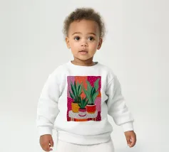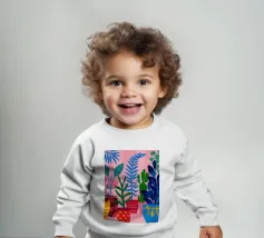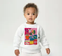 Una collezione di rigogliose piante d'appartamento in vaso con un gatto comodamente adagiato nelle vicinanze, su uno sfondo rosa, che crea una giungla domestica serena ed elegante.