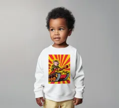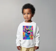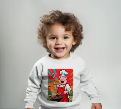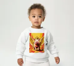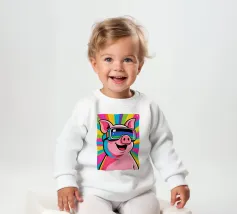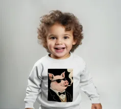 Un'illustrazione giocosa di un volto di maiale sorridente su un vivace sfondo arancione. I colori vivaci e lo stile da cartone animato creano un design vivace e allegro, perfetto per progetti creativi o concetti a tema agricolo.