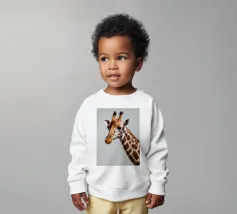 Una giraffa si staglia in primo piano, ornata da motivi vivaci e colorati. Lo sfondo è una sfumatura liscia, che esalta l'aspetto unico della giraffa in un ambiente vivace.
