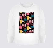 Un motivo dinamico e divertente di forme astratte colorate e di ispirazione retrò è sparso come coriandoli su uno sfondo nero, creando un disegno vibrante ed energico dal sapore vintage.