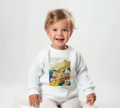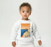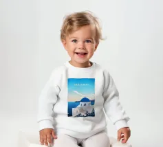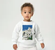 Design di viaggio minimalista della Grecia con le famose case bianche dell'isola greca di Santorini, le rocce vulcaniche e il blu del Mar Mediterraneo. Tipiche case graziose come nei villaggi di Oia e Fira.